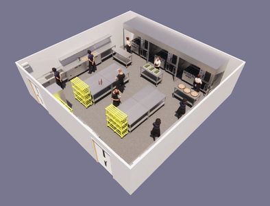 150, 300, and 500 sq. ft. kitchens for rent with shared dry goods, refrigeration, and freezers.